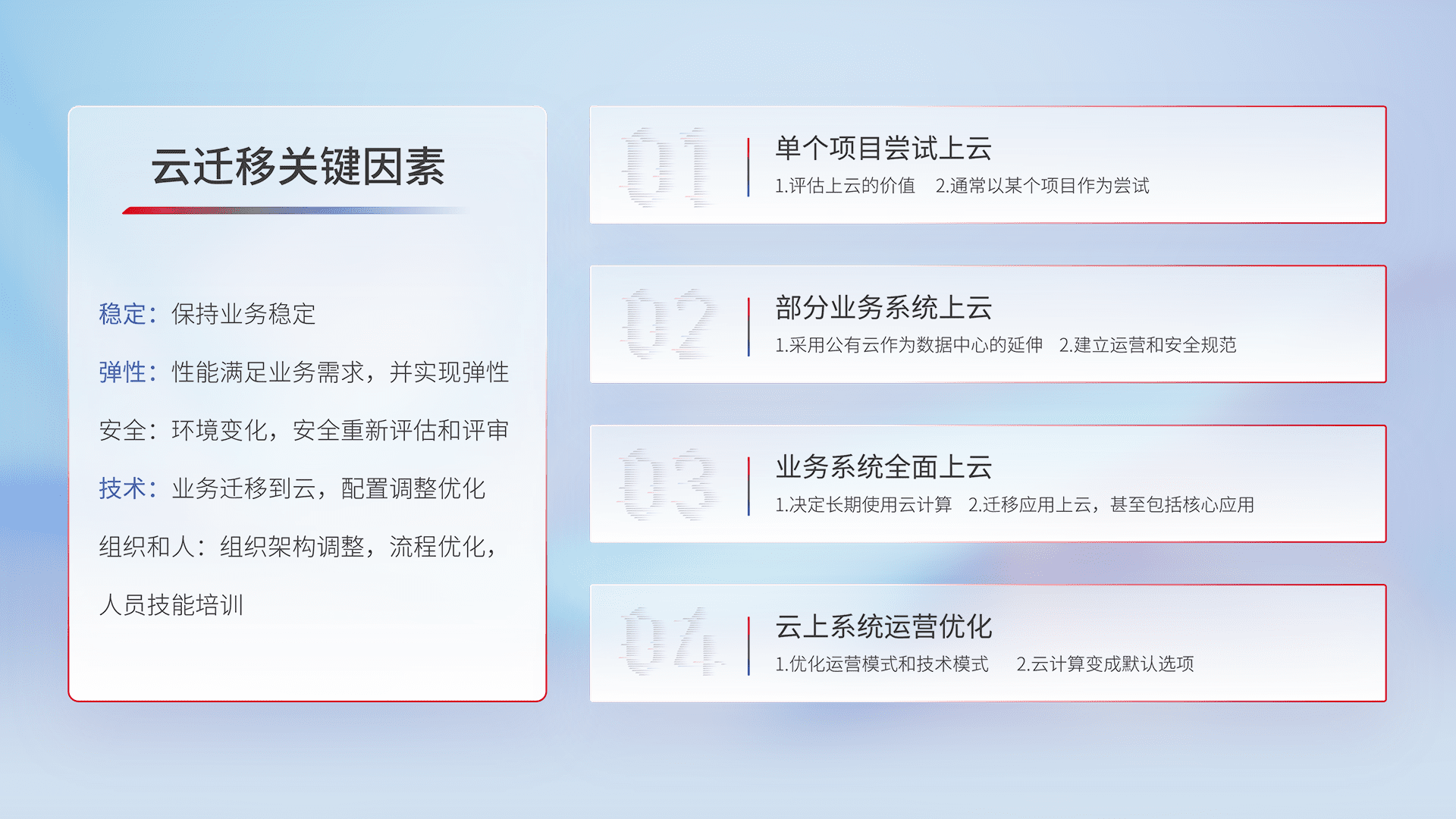 结合实际业务,,,从规划设计、、、云平台选型、、云原生改造、、数据迁移、、集成交付,,,迁移全过程为客户识别最佳上云路径,,做好风险识别管理,,,设计网络架构、、、身份权限、、、安全审计合规、、、、操作审计、、日志审计、、、监控告警策略、、多站点容灾设计等,,,,对云上基础设施进行整体规划,,,,提升IT治理水平,,,,以满足弹性、、、、高可用、、、高性能的需求。。。