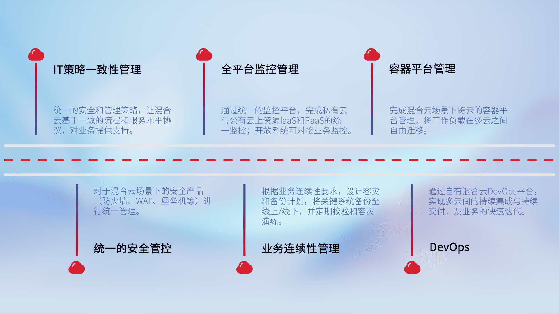 以中立管理模式,,解决多组织、、多云、、多运维厂商的复杂关系的管理,,保证多云平台资源配置的一致性,,,,实时掌控云资源运行数据。。。