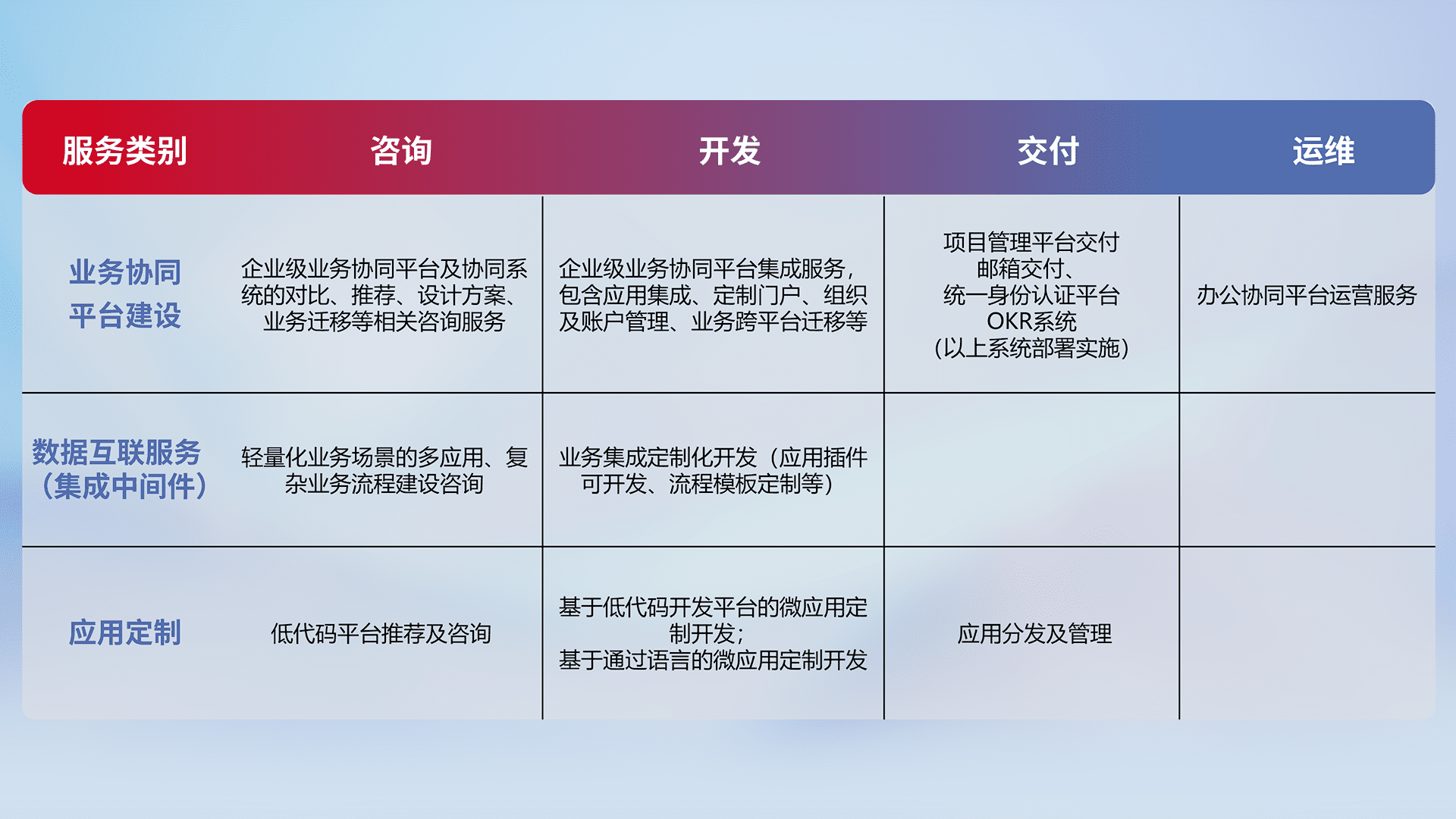 针对钉钉、、、、企微、、、IDaas等平台级产品提供产品的规划、、、方案、、、交付、、、、定制化开发等服务,,,,实现如统一协同办公、、、、智能客户服务、、、混合会议管理、、智能数据查询、、、、等业务场景,,,实现数字化转型。。。。